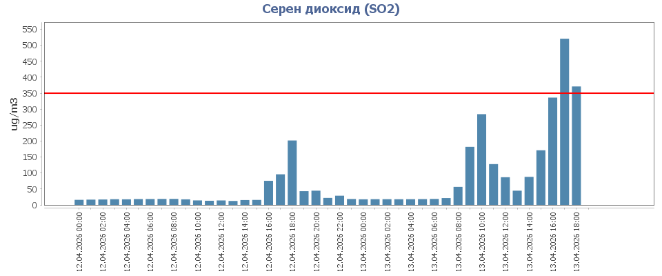 Ситуацията се влошава в следобедните часове. В 16:00 часа е отчетена стойност от 336,19 µg/m³ – близо до допустимия максимум. Само час по-късно обаче е регистрирано рязко превишение – 520,68 µg/m³ в 17:00 часа, последвано от 371,11 µg/m³ в 18:00 часа, което също остава над нормата.