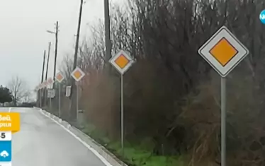 Това е кадър от истински поставени на пътна отсечка от 360 метра цели 14 еднакви пътни знака.