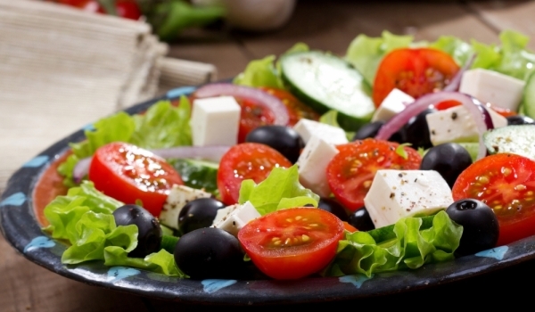 Зелената салата се измива добре и листата се накъсват. Слагат се в купа и се добавят маслините и нарязаните на ивици домати и чушка. Отгоре се нареждат кубчета сирене и се залива със заливката, приго...