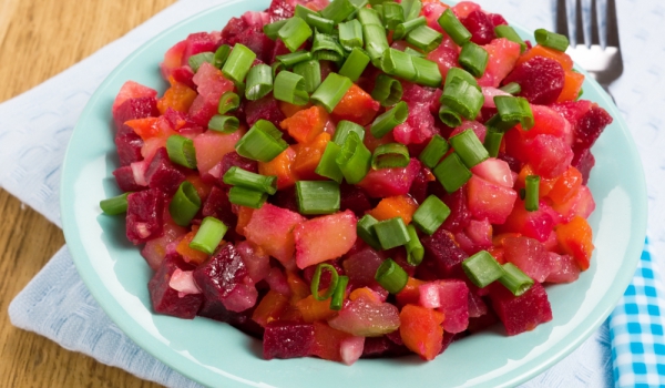 Сварете поотделно картофите и цвеклото до омекване. Картофите се белят още докато са горещи и се нарязват на кубчета. Цвеклото същ се обелва и нарязва на кубчета. Сварените зеленчуци се смесват в дълб...